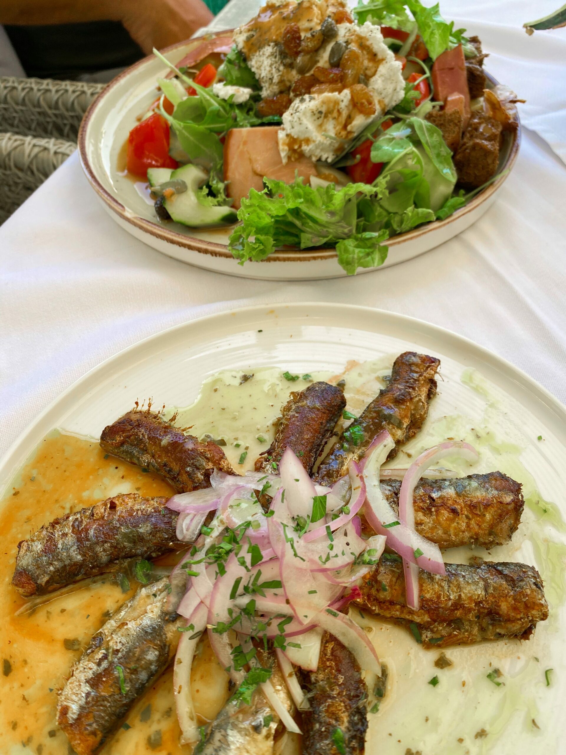 (We also had grilled octopus, salad, cooked garlicky greens, stuffed grape leaves, beef patties, and little doughnuts)
