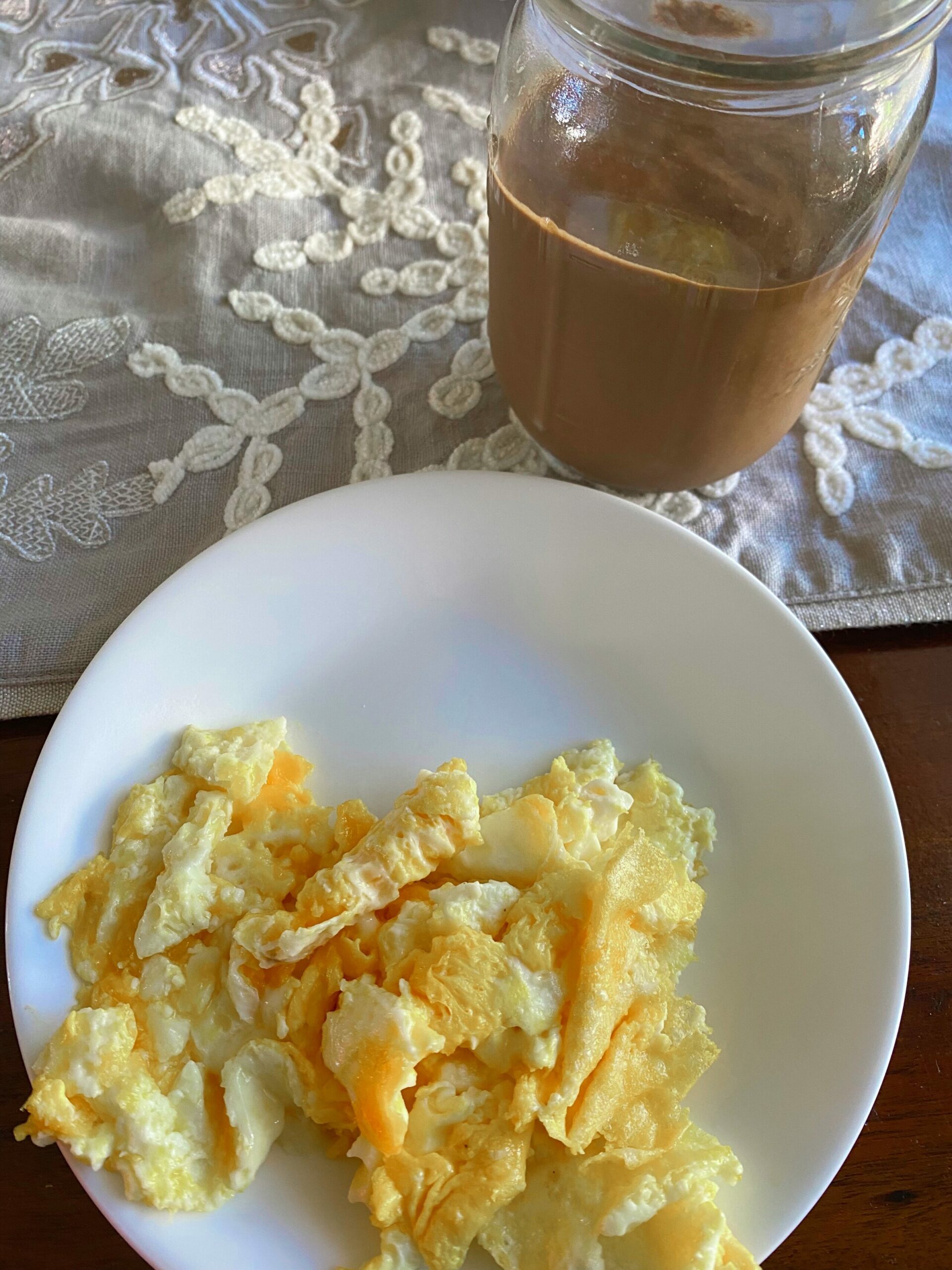 9:30 back home and having the rest of my breakfast: two scrambled eggs and a smoothie with avocado, pumpkin seeds, frozen zucchini, cocoa powder, dates, protein powder, and almond milk.