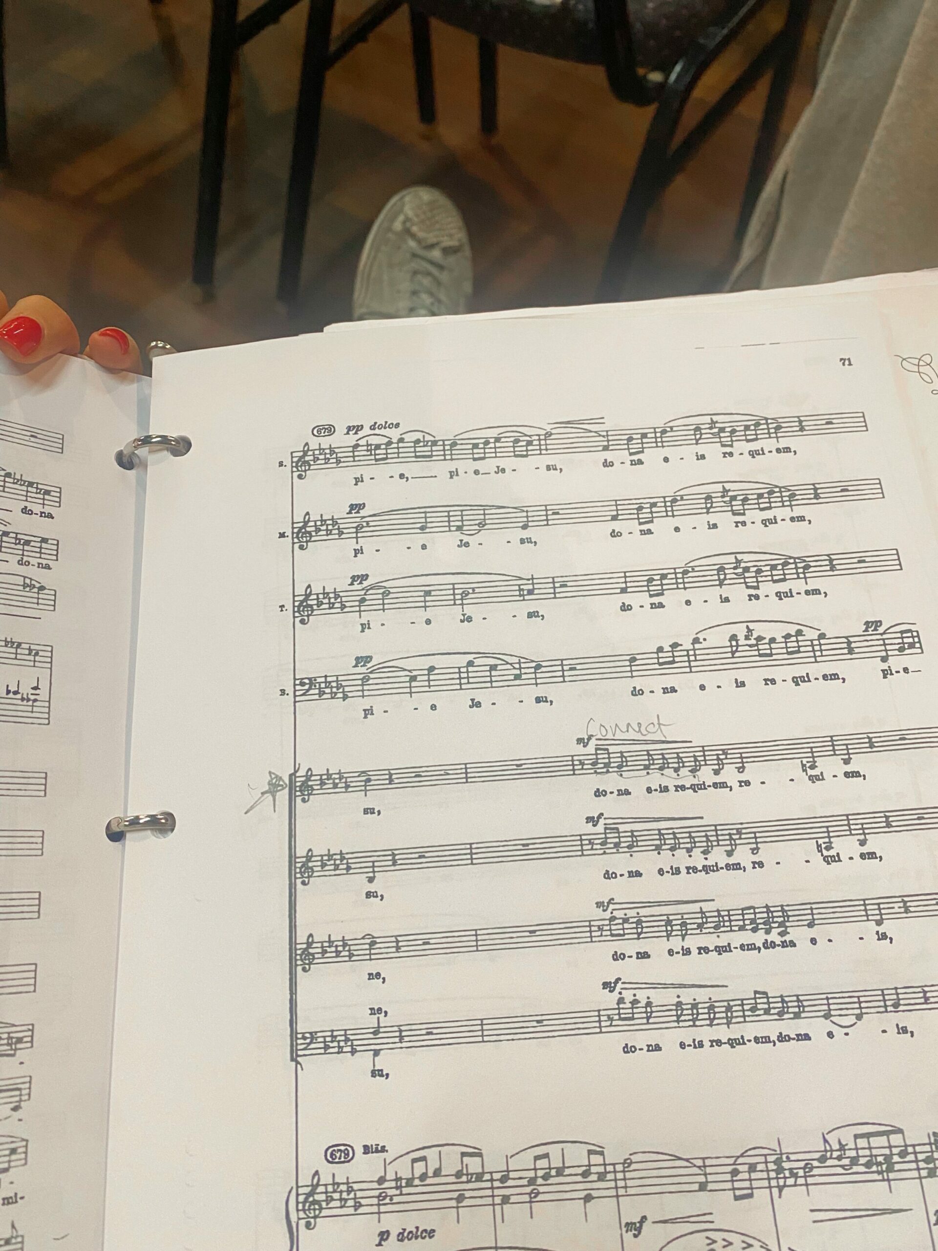7pm Choir practice! I look forward to this all week. We’re currently doing Verdi’s Requiem (it’s a LOT, but breathtakingly amazing) and it sets my soul free.