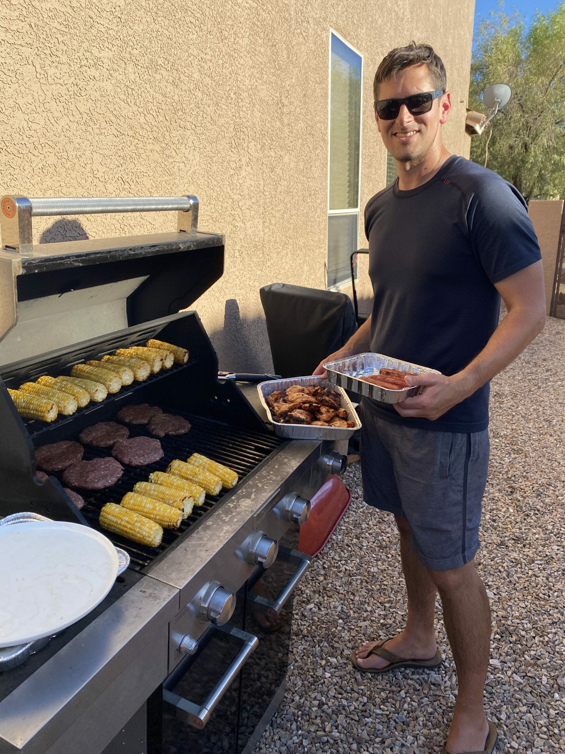 (he cooked up burgers, tons of BBQ chicken thighs, hot dogs, and corn on the cob and everything was amaaaazing)