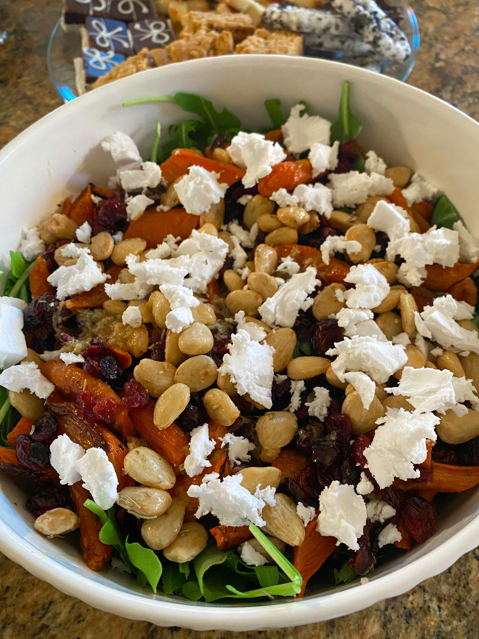 For the meal, we had appetizers (a giant gorgeous charcuterie board my friend brought over, sun-dried tomato dip and crackers), my fave fall salad, roast chicken, potatoes, and fresh sourdough.