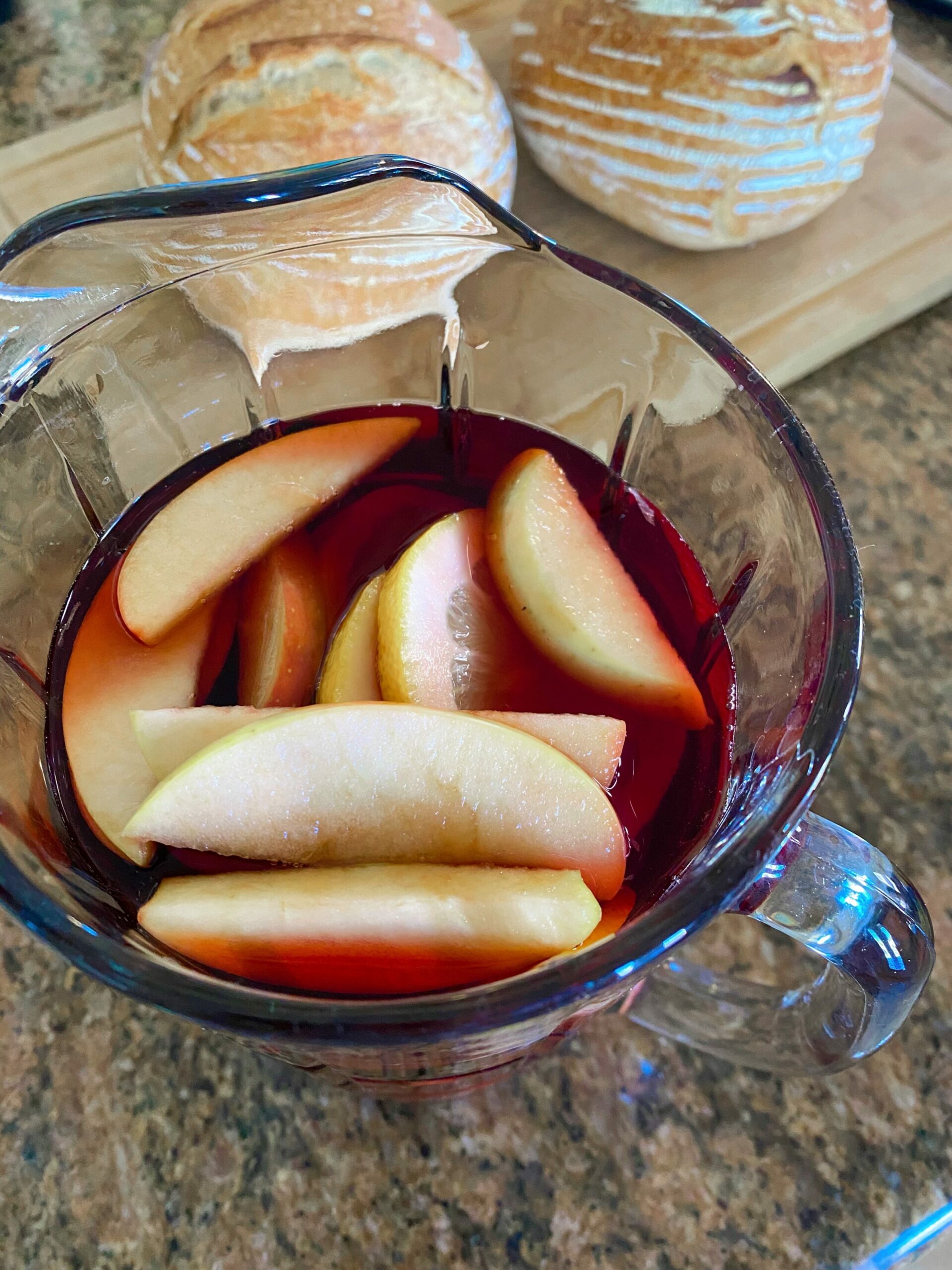 I made some chocolate peanut butter bars, and then added different cookies and chocolate pretzels from the Whole Foods cookie bar, along with some chocolate mousse bars from Trader Joe’s. The kids had hot cocoa, and the adults had tequila sangria.