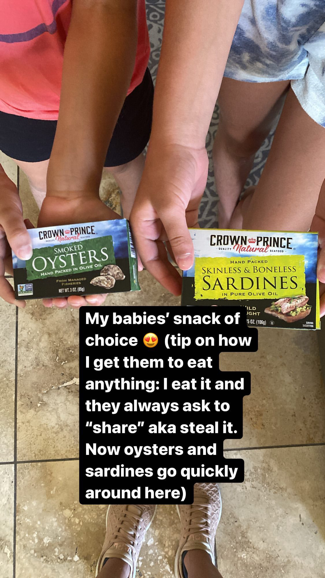 (Their favorite snack: smoked oysters and skinless/bonless sardines. They eat them straight-up out of the can.)
