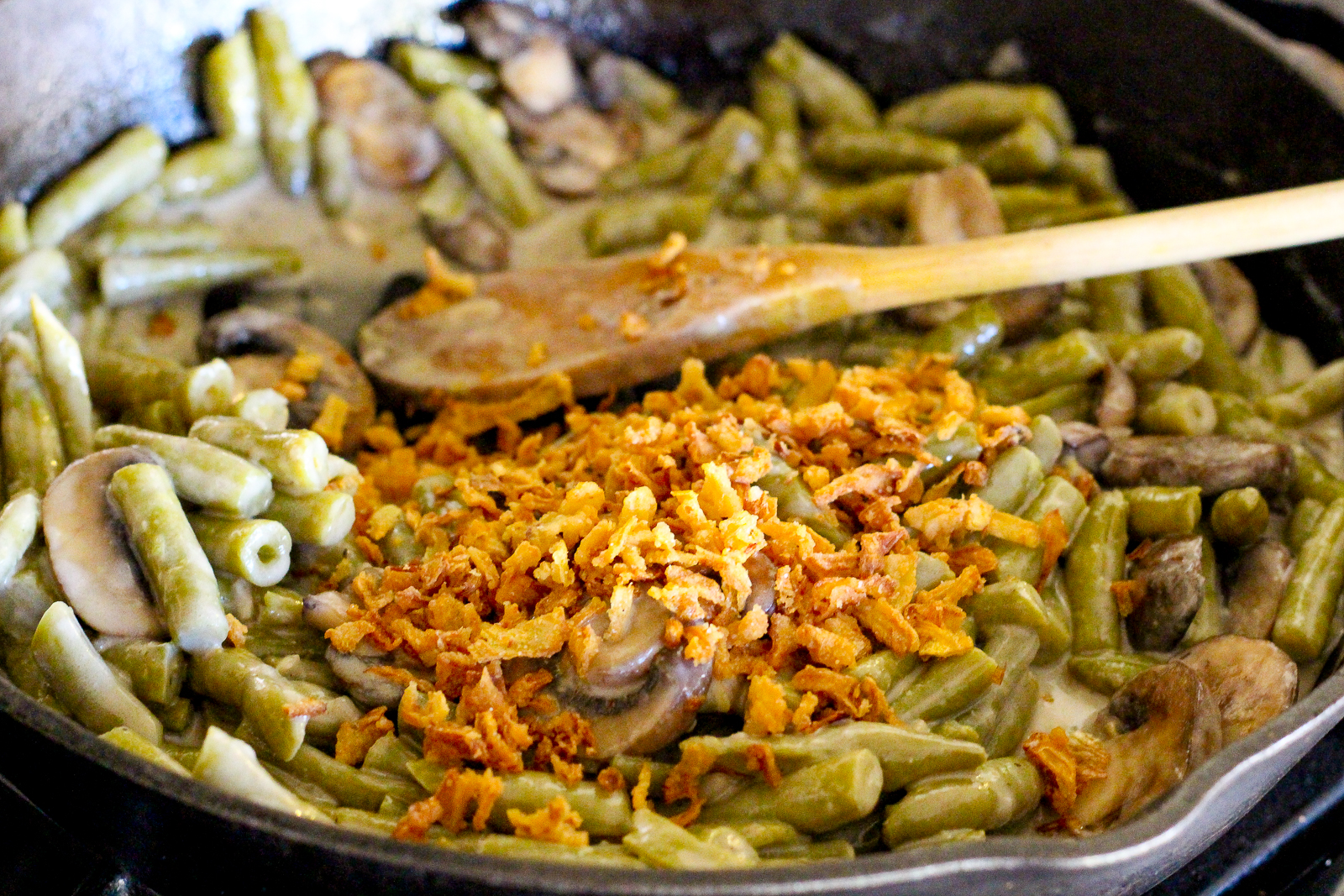 Add the green beans and 1/3 cup crispy onions. Transfer the mixture to a casserole dish or baking dish. Cover and store in the fridge until ready to bake.