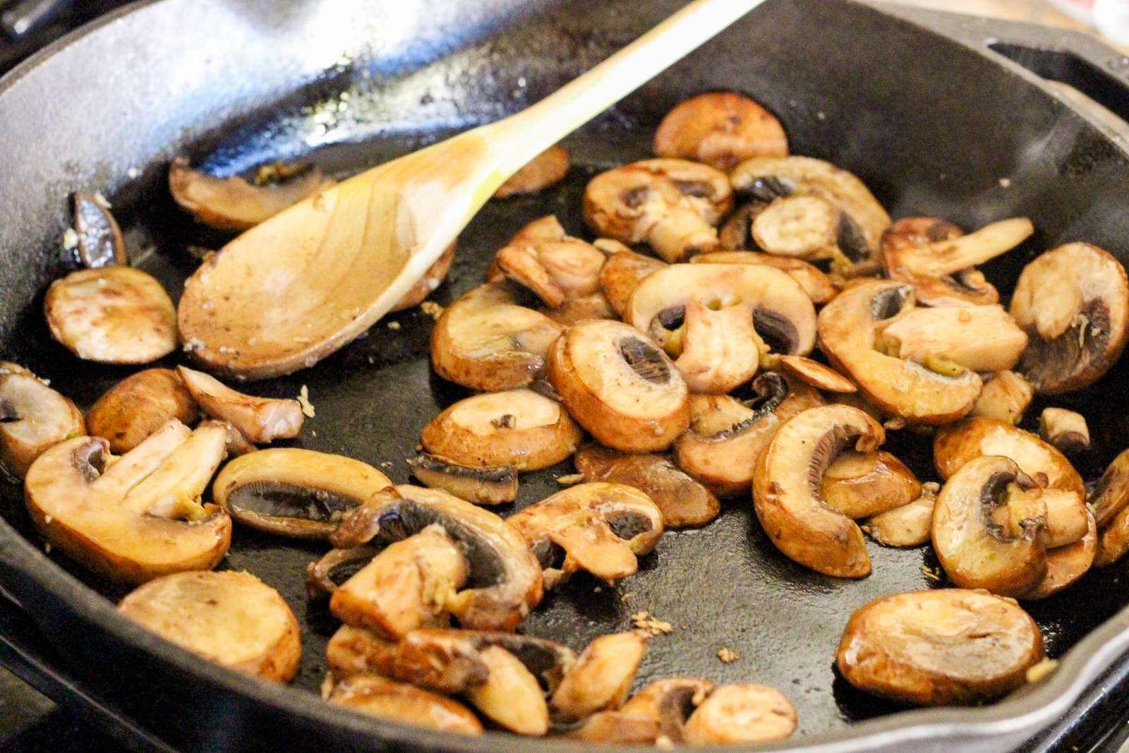 Start by sautéing the mushrooms and garlic in a little olive oil on medium heat, until soft, about 5 minutes. Season well with salt and pepper.
