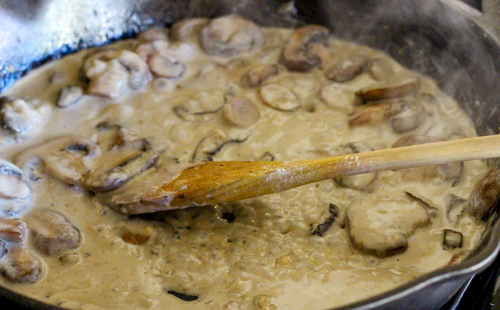 – 1/2 cup coconut cream (if you don’t want this to have a slight coconut flavor, use 2 tablespoons Kite Hill cream cheese and 1/3 cup almond milk, or other non-dairy milk). We’re making our own vegan version of cream of mushroom soup.