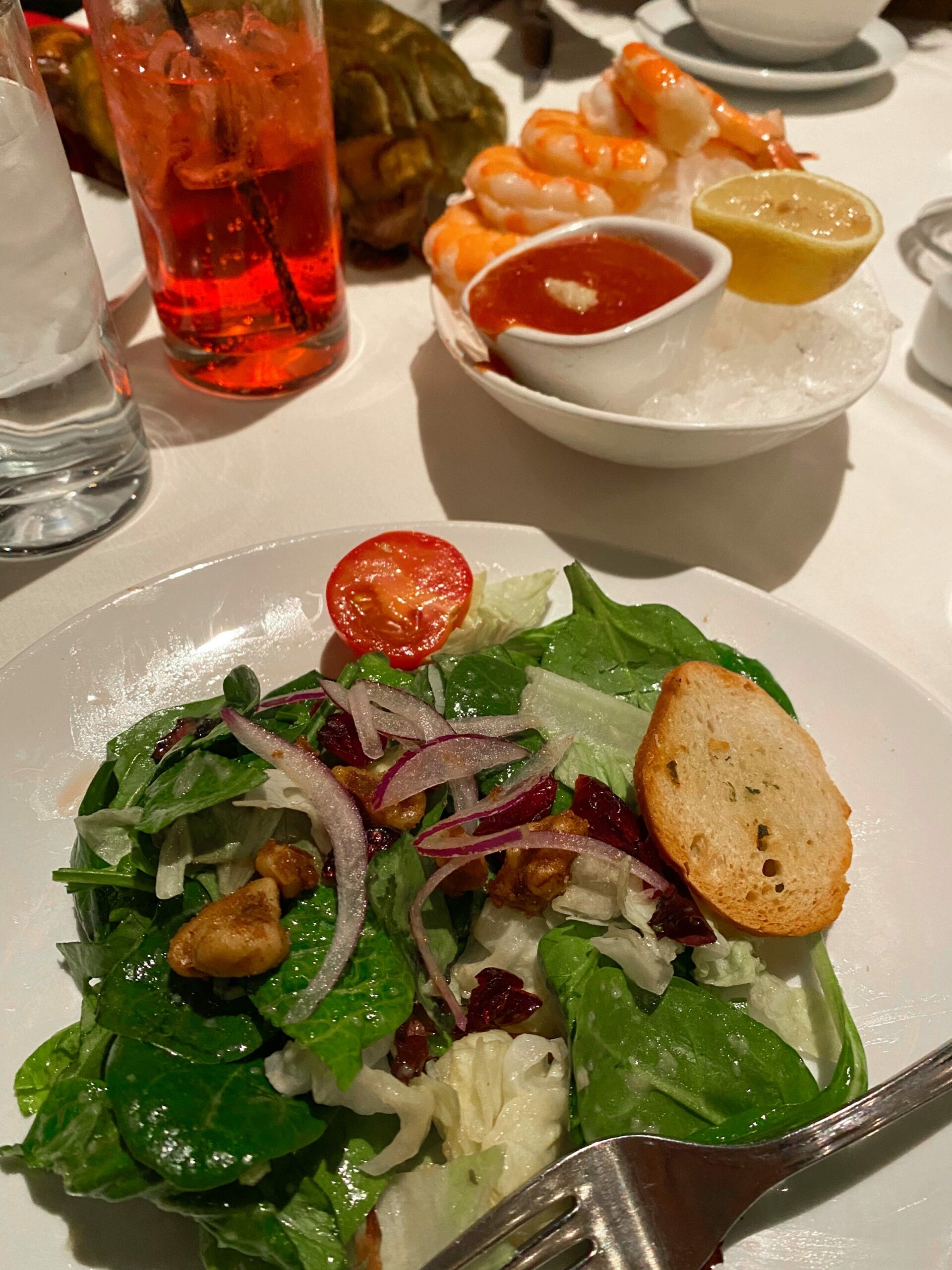 We started with the salad (the Pilot and I split one), a shrimp cocktail, and P had the cheese plate from the kids’ menu. Liv and the Pilot also got cups of lobster bisque – I tried a taste and it was aaaaamazing. For our entrees, we all got filets, and shared asparagus, onion rings, and Fleming’s potatoes (cheese and lightly spicy). The Pilot stopped eating desserts back in October so I shared this chocolate lava cake with Liv (P had ice cream and whipped cream). I had some sauvignon blanc and a Valentine’s cocktail that had gin, strawberry and lemon.