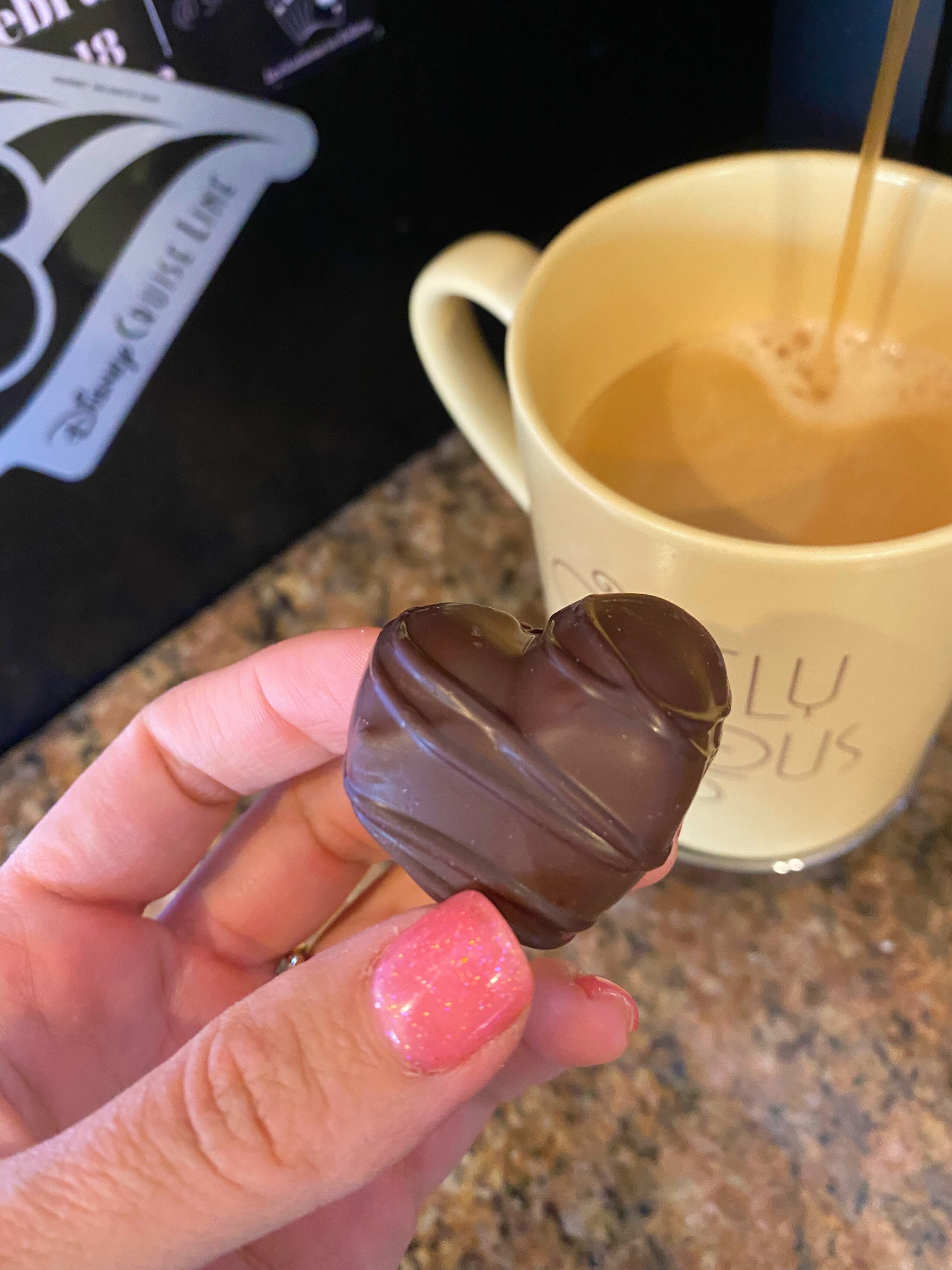 a decaf coffee with almond milk, collagen, and a See’s heart truffle.